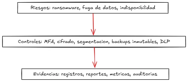 - Controles (27002): medidas específicas para tratar esos riesgos (p. ej., MFA, cifrado, segmentación, backups inmutables, DLP).