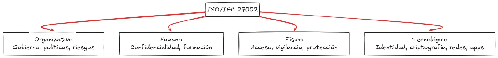 - Organizativo: gobierno, políticas, gestión de riesgos, continuidad, terceros, cumplimiento.